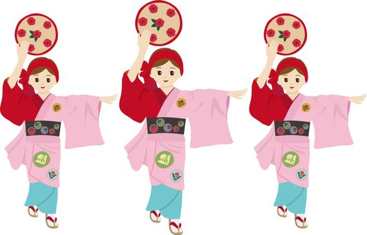踊り手たちは、特産の紅花をあしらった花笠と団体ごとに揃いの浴衣を身につけて、集団ごとに山車に先導されて踊ります。