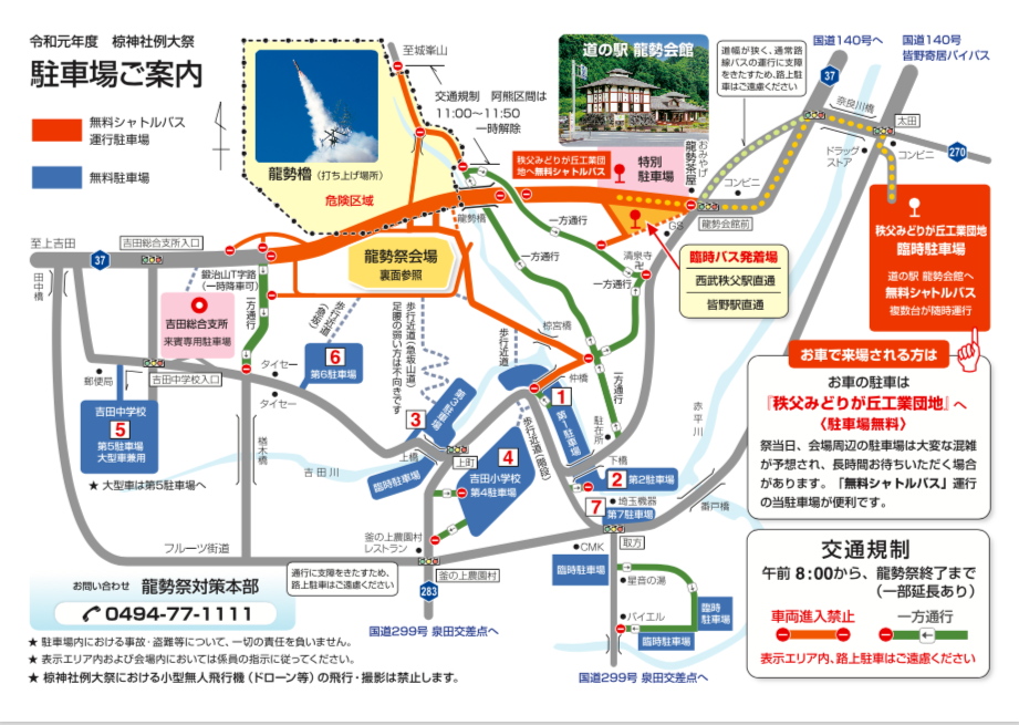 秩父みどりが丘工業団地より道の駅龍勢会館まで、無料シャトルバスが複数台随時運行します。