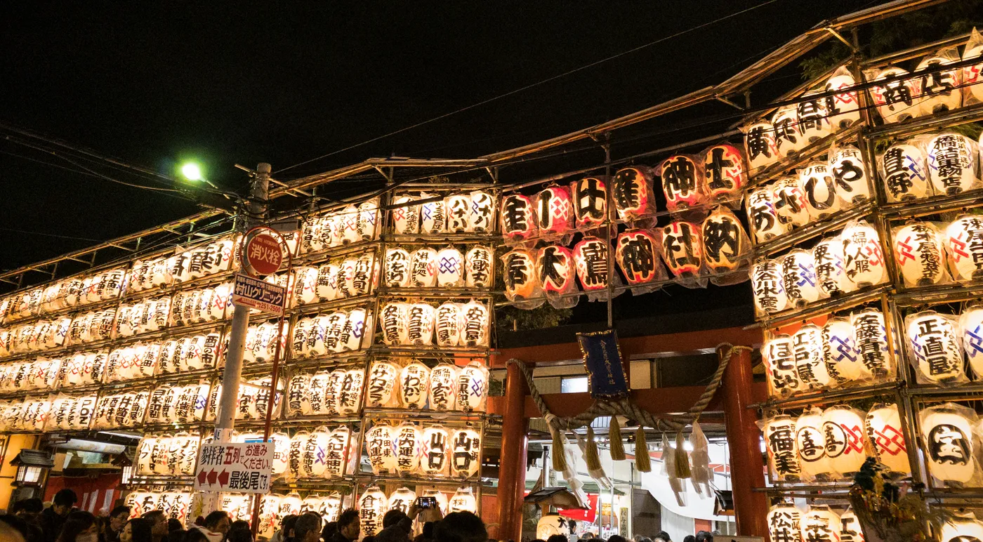 眩い提灯や飾られた熊手、屋台の明かりで夜は歩いているだけでも楽しい気分になれますよ!